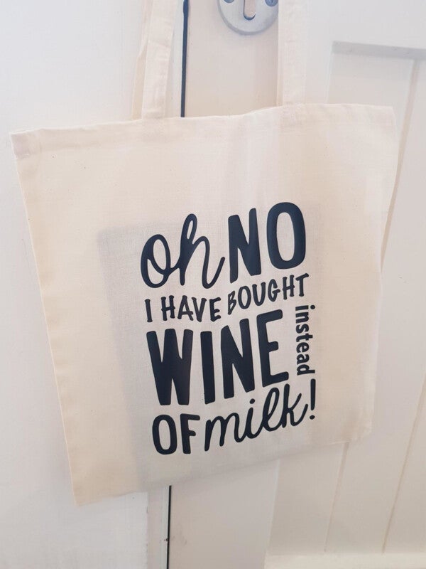 100% katoenen tas met de opdruk Oh no, I have bought wine instead of milk!Levertijd is ca 3 werkdagen.